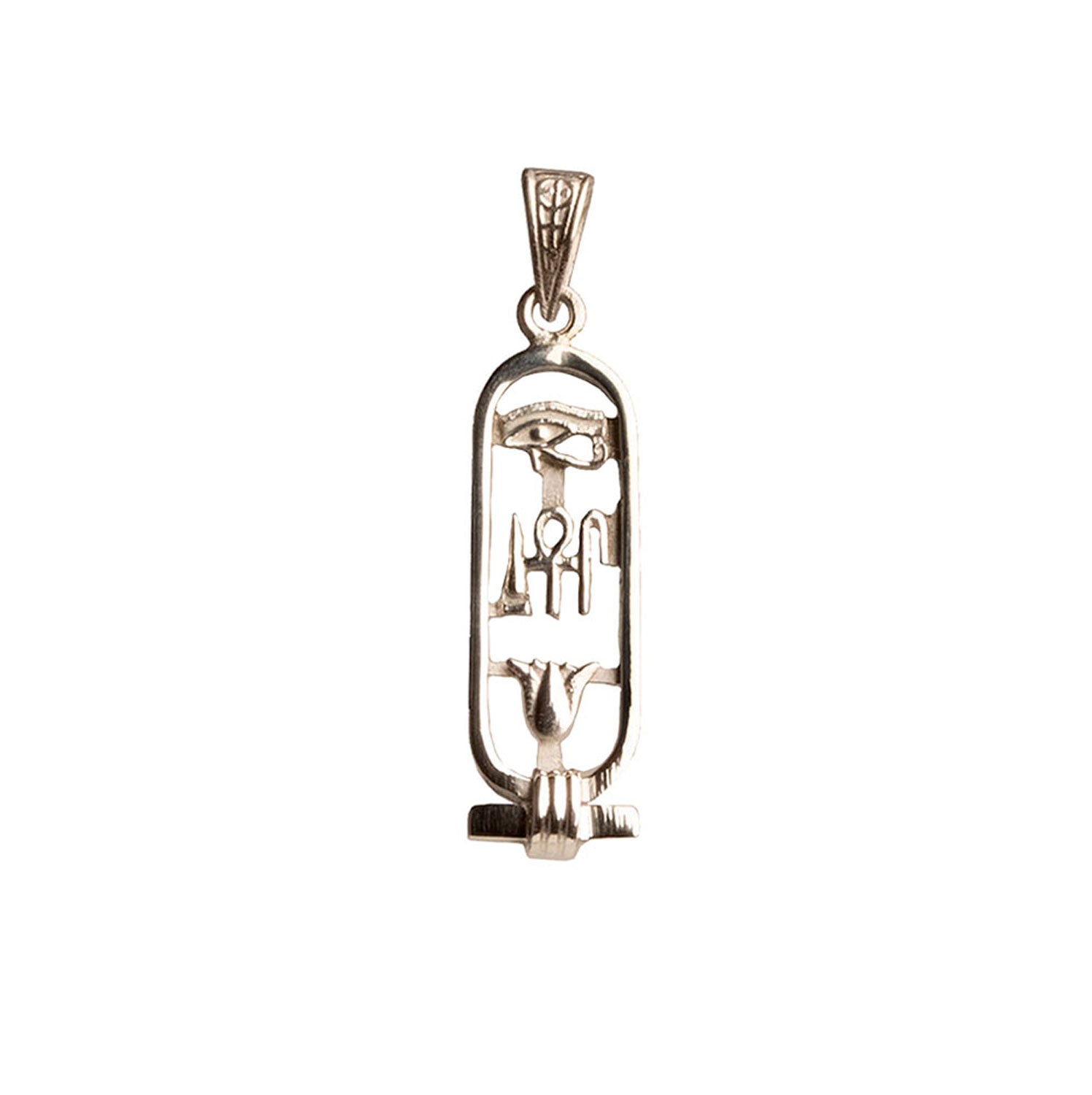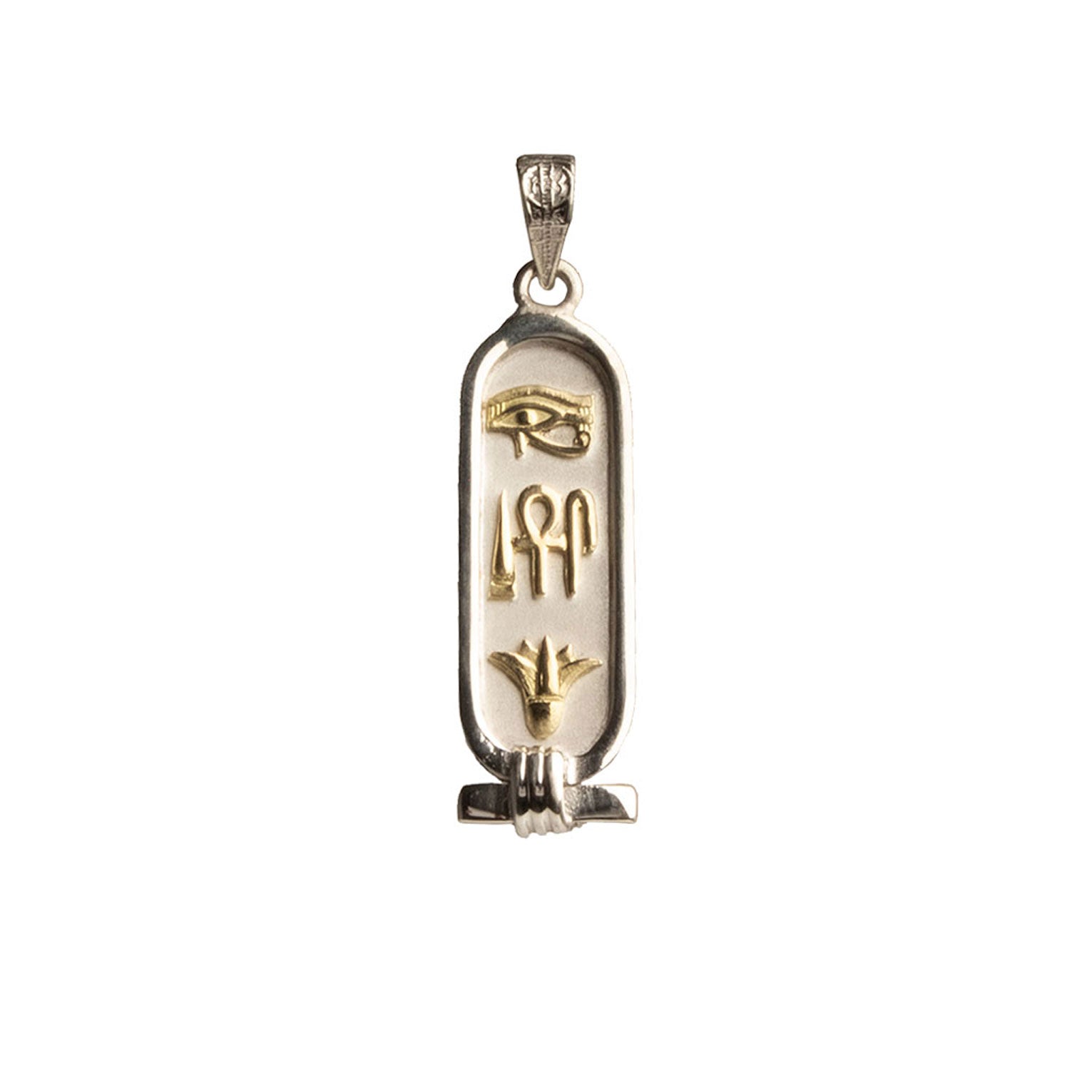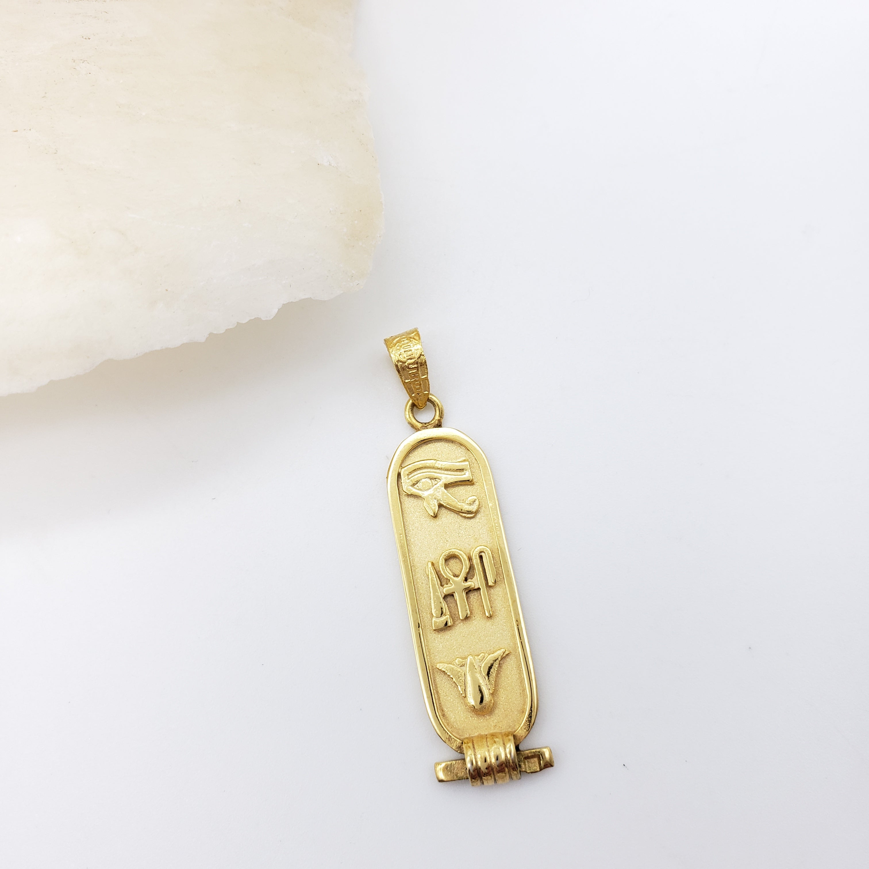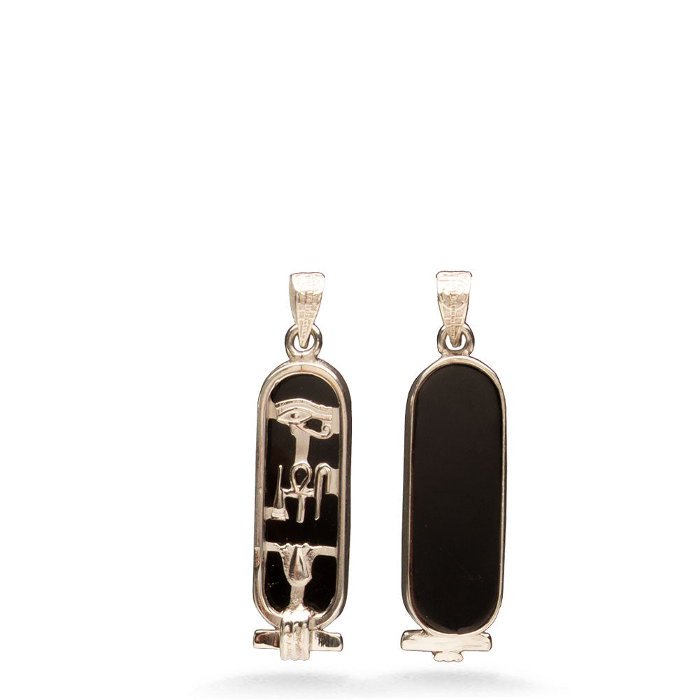 This cartouche features the three hieroglyphic symbols for 'Health, Life, & Happiness.' The Eye of Horus at the top is a healing symbol. It symbolizes protection for the wearer and their strength. In the middle are ancient symbols that represent health, life, and happiness. The bottom is the lotus flower, symbolizing rebirth and rejuvenation. In Egyptian mythology, the sun was born from a lotus.
