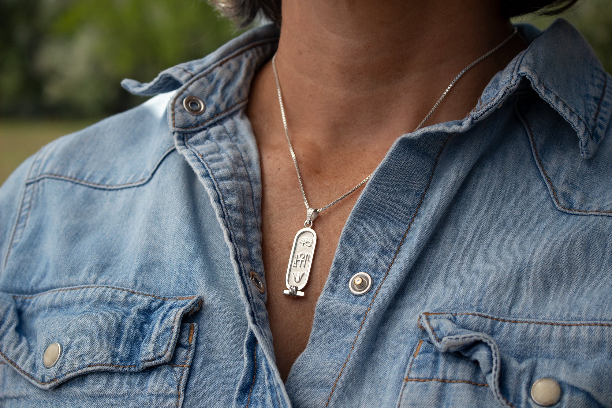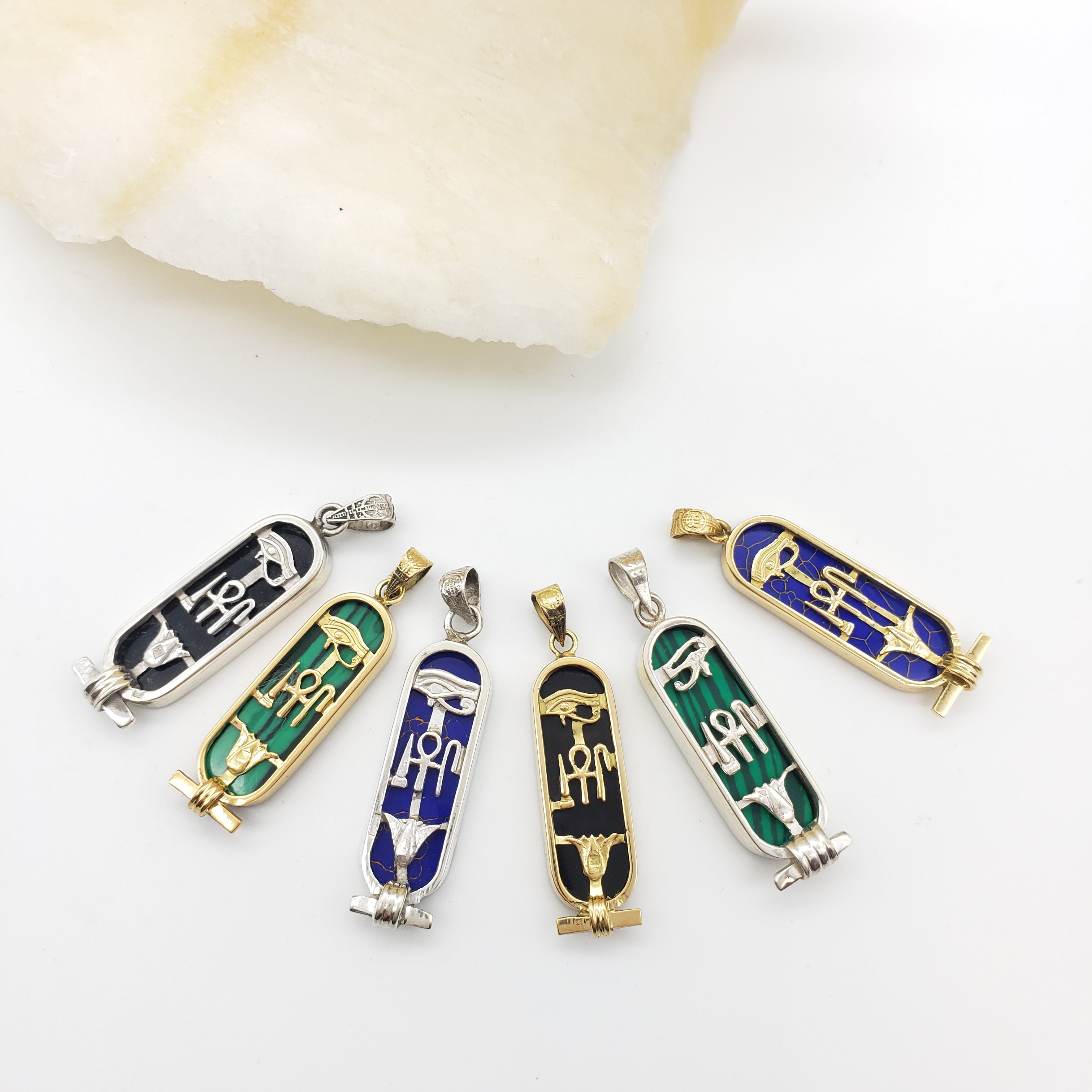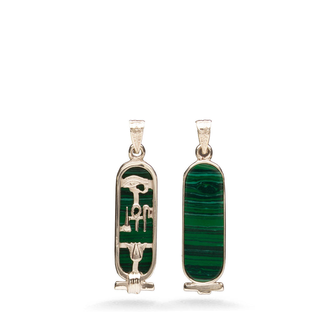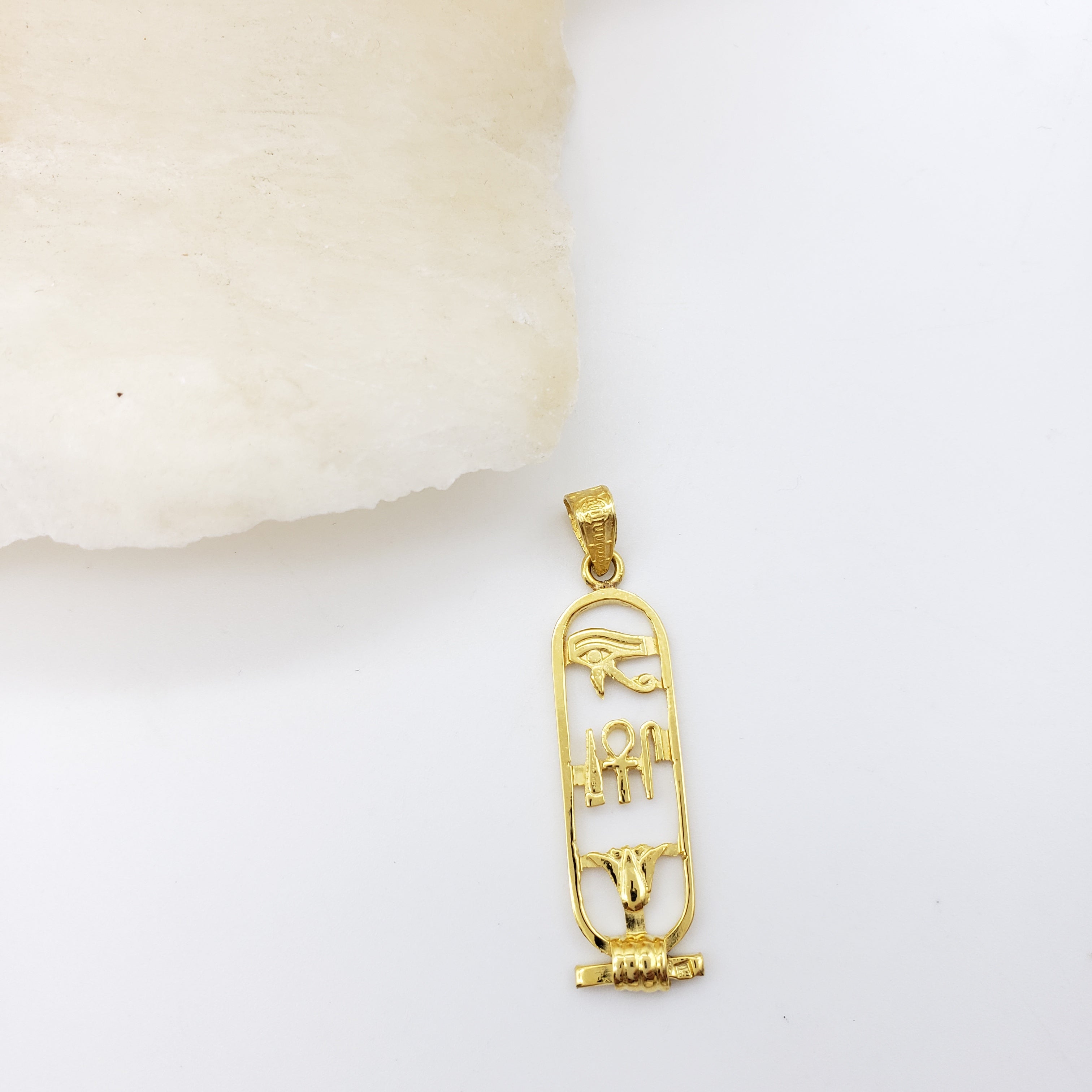 This cartouche features the three hieroglyphic symbols for 'Health, Life, & Happiness.' The Eye of Horus at the top is a healing symbol. It symbolizes protection for the wearer and their strength. In the middle are ancient symbols that represent health, life, and happiness. The bottom is the lotus flower, symbolizing rebirth and rejuvenation. In Egyptian mythology, the sun was born from a lotus.