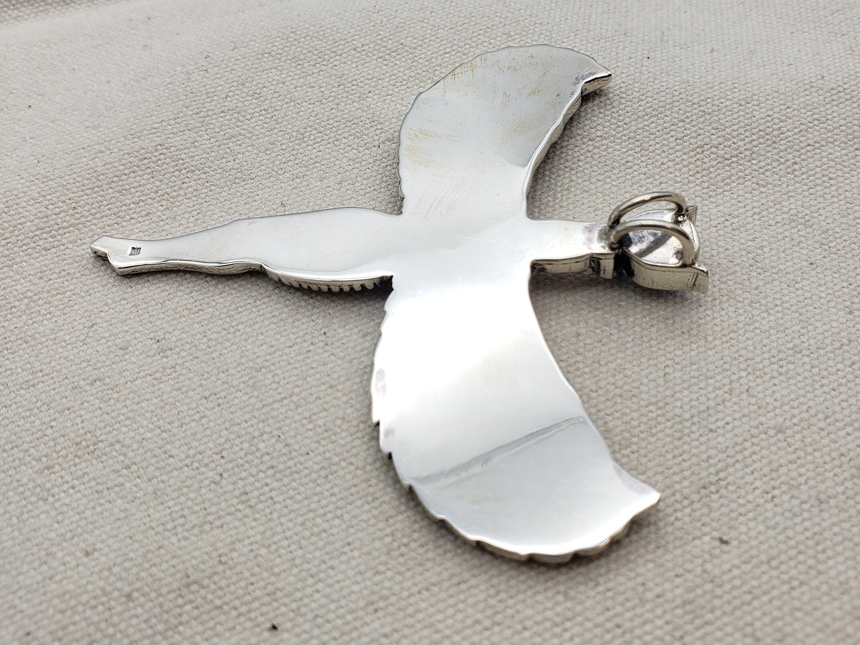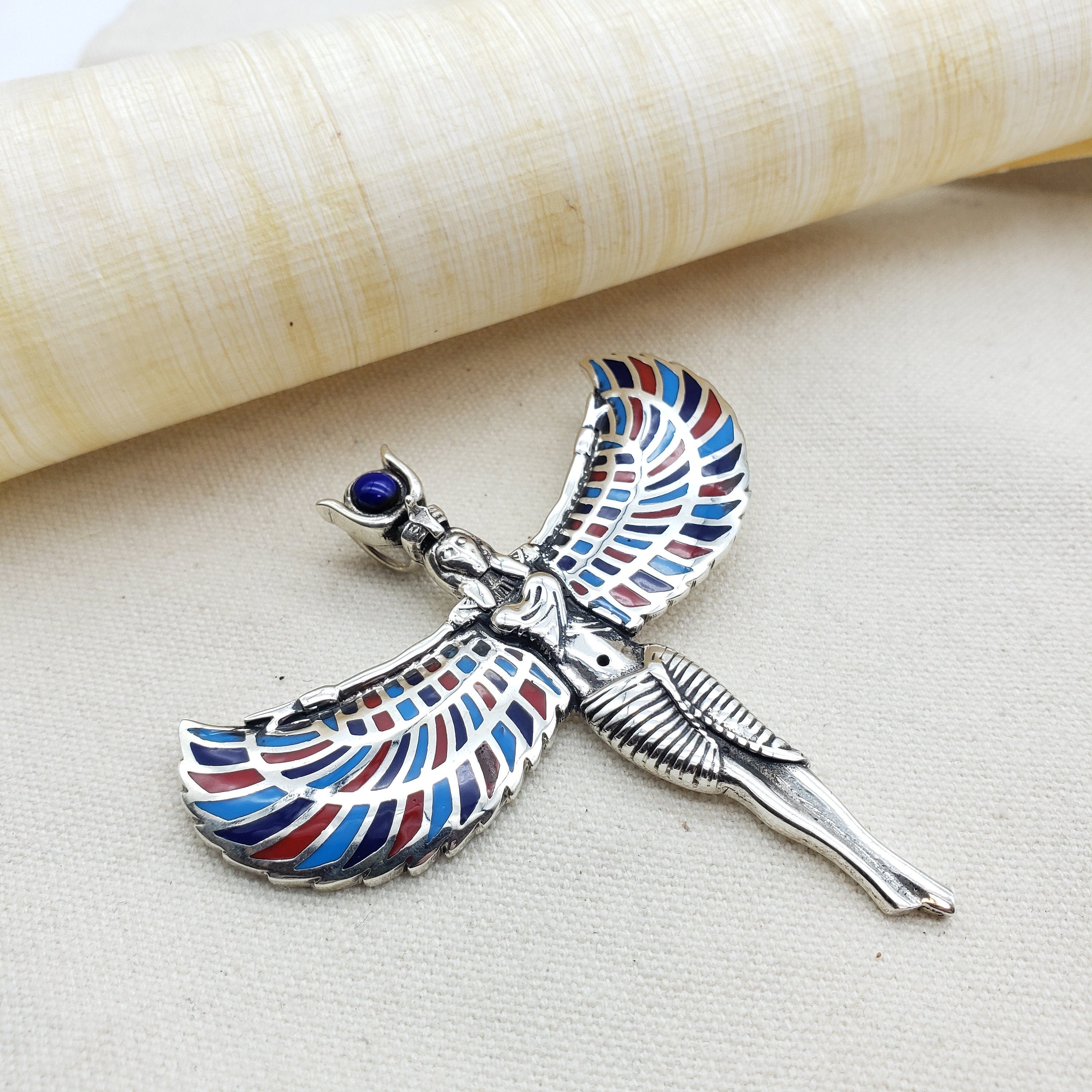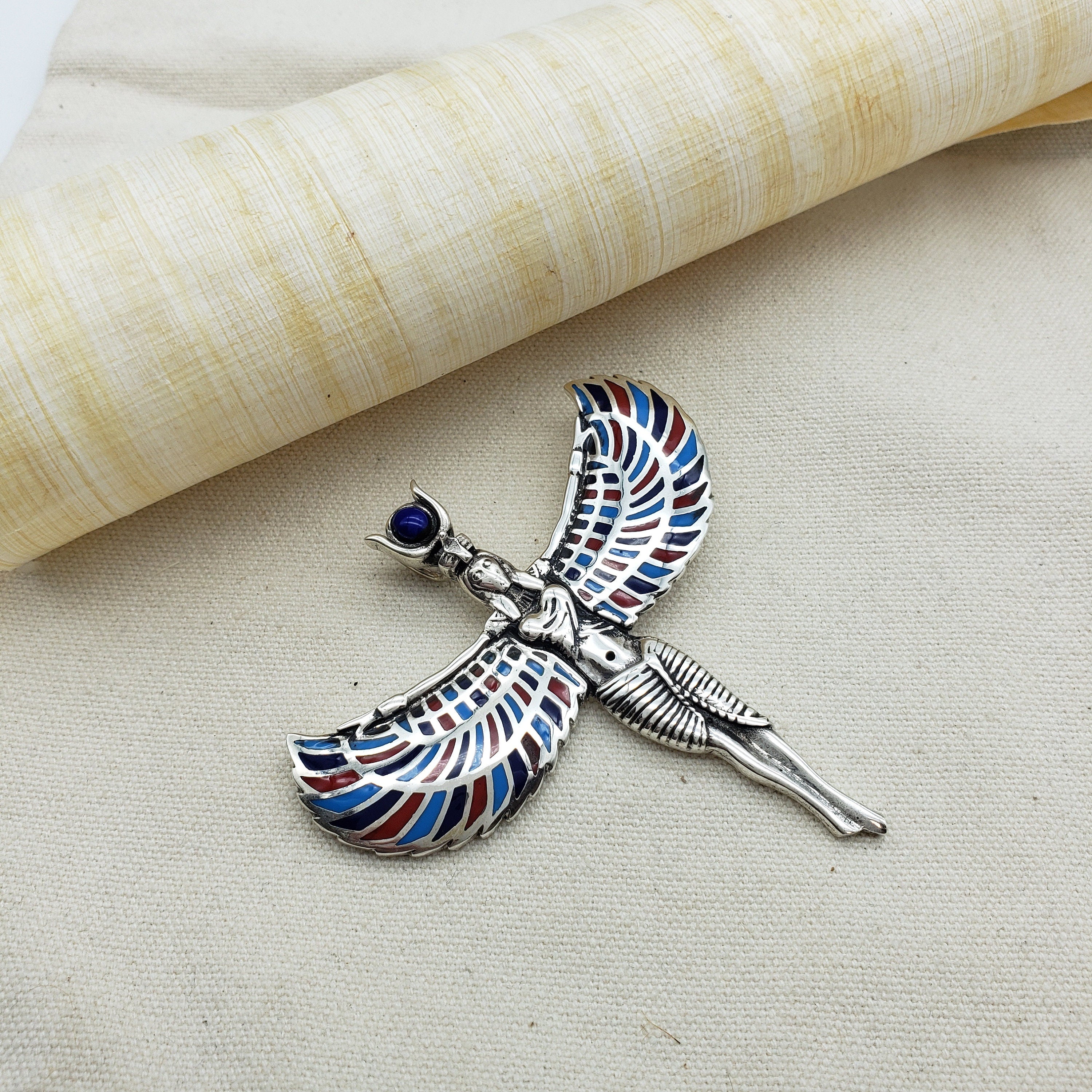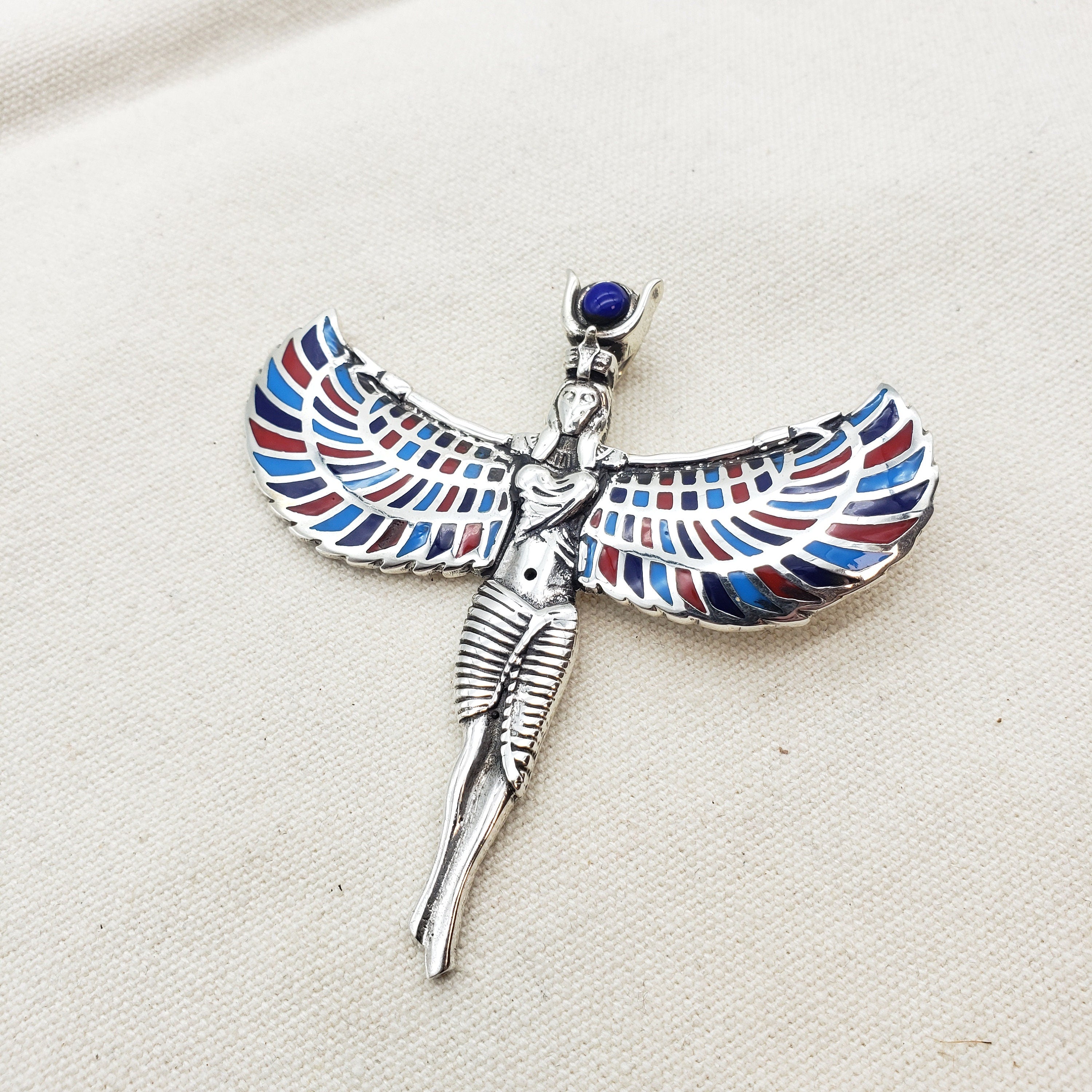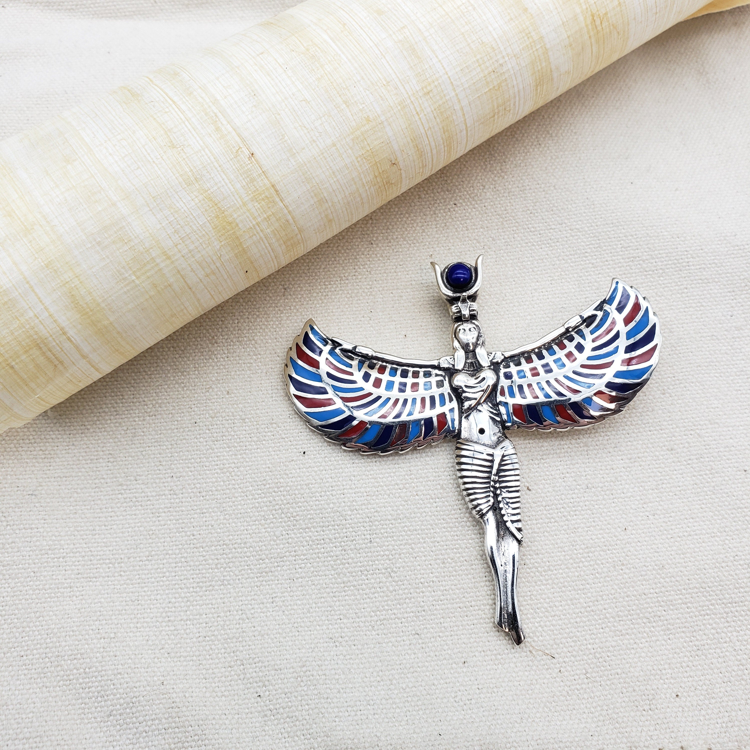 This large Egyptian pendant is truly one of a kind. It was inspired by the Egyptian goddess Isis. It has a heavy weight and comes with a 22-inch sterling silver chain. It is made from sterling silver and colorful epoxy. The silver is stamped by the Egyptian government certifying the silver content. I have selected this for the market in Cairo on a recent trip.
