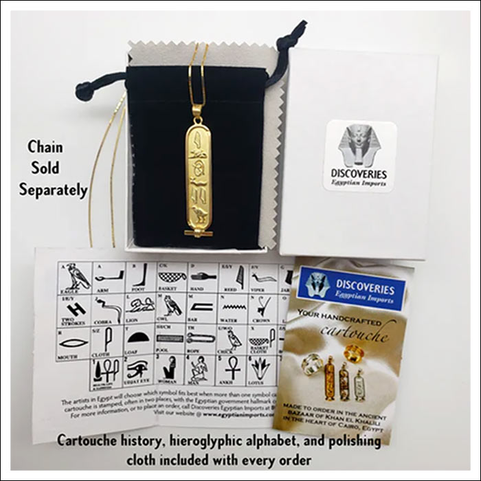 Includes hieroglyphic alphabet chart, polishing cloth, a jewelry box, and a velvet bag.