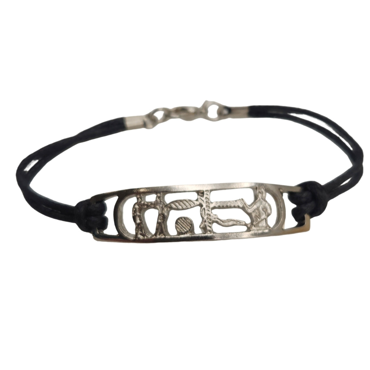 This bracelet spells FRIENDS in phonetic hieroglyphs, enclosed in a cartouche for eternal protection. Translation included on the back of the packaging. This pewter bracelet is on a faux leather cord. The bracelet length is 8 inches long with a lobster claw closure.