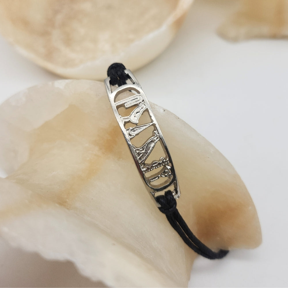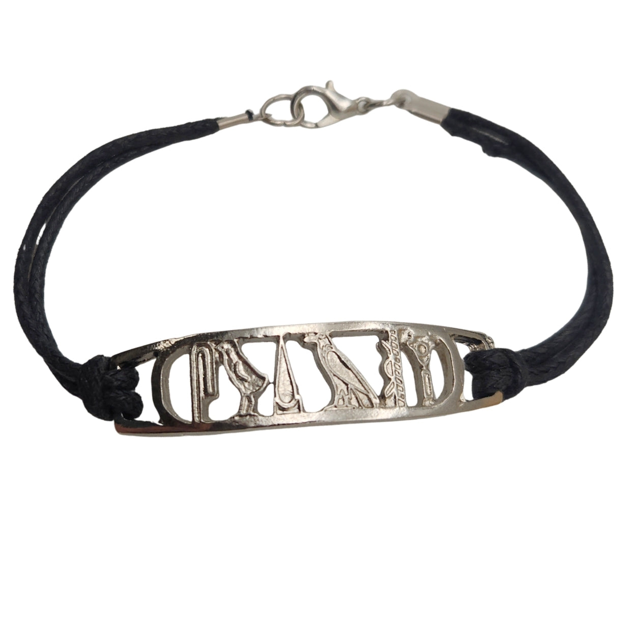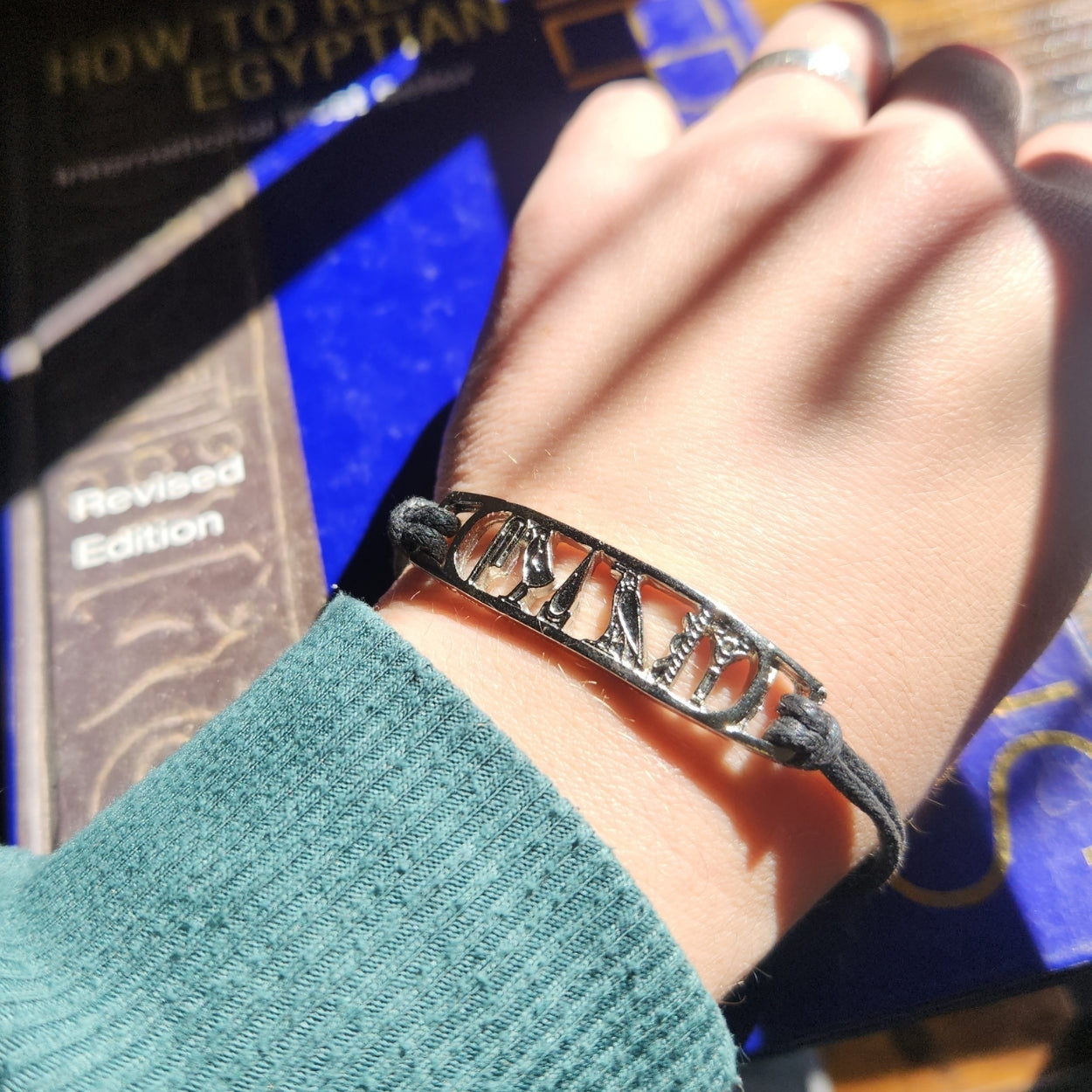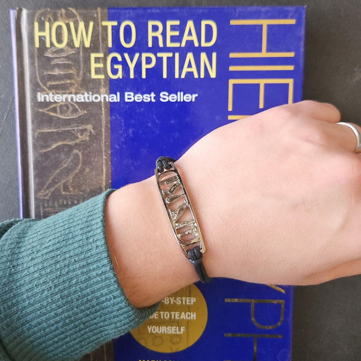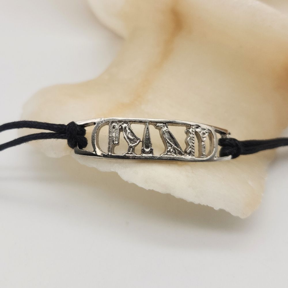 This bracelet represents LOVE in hieroglyphic symbols, enclosed in a cartouche for eternal protection.