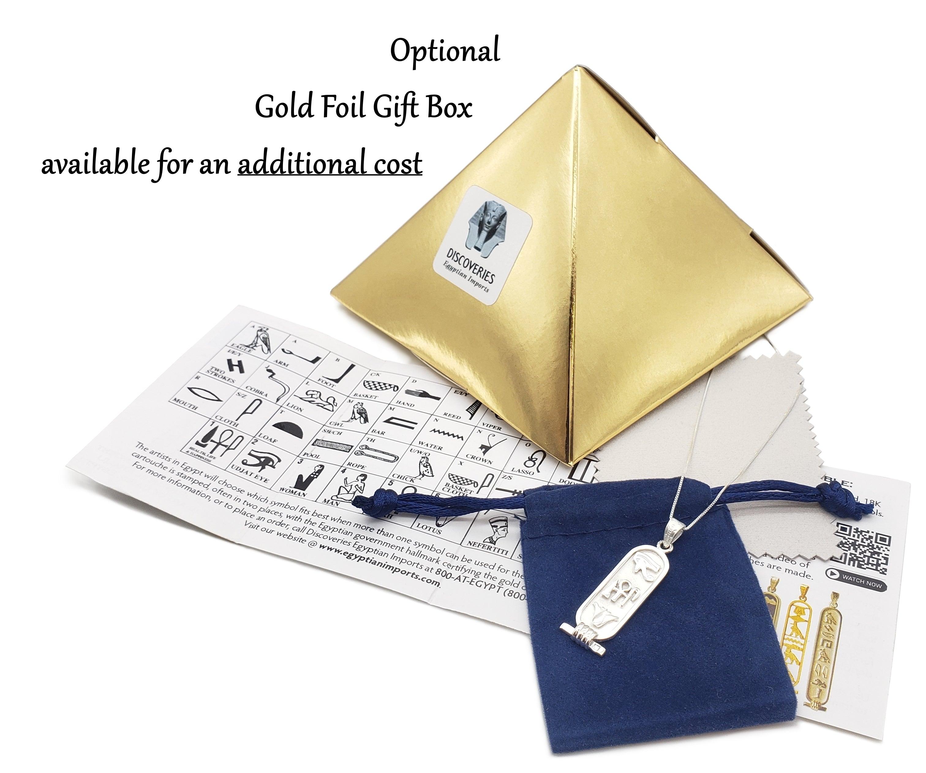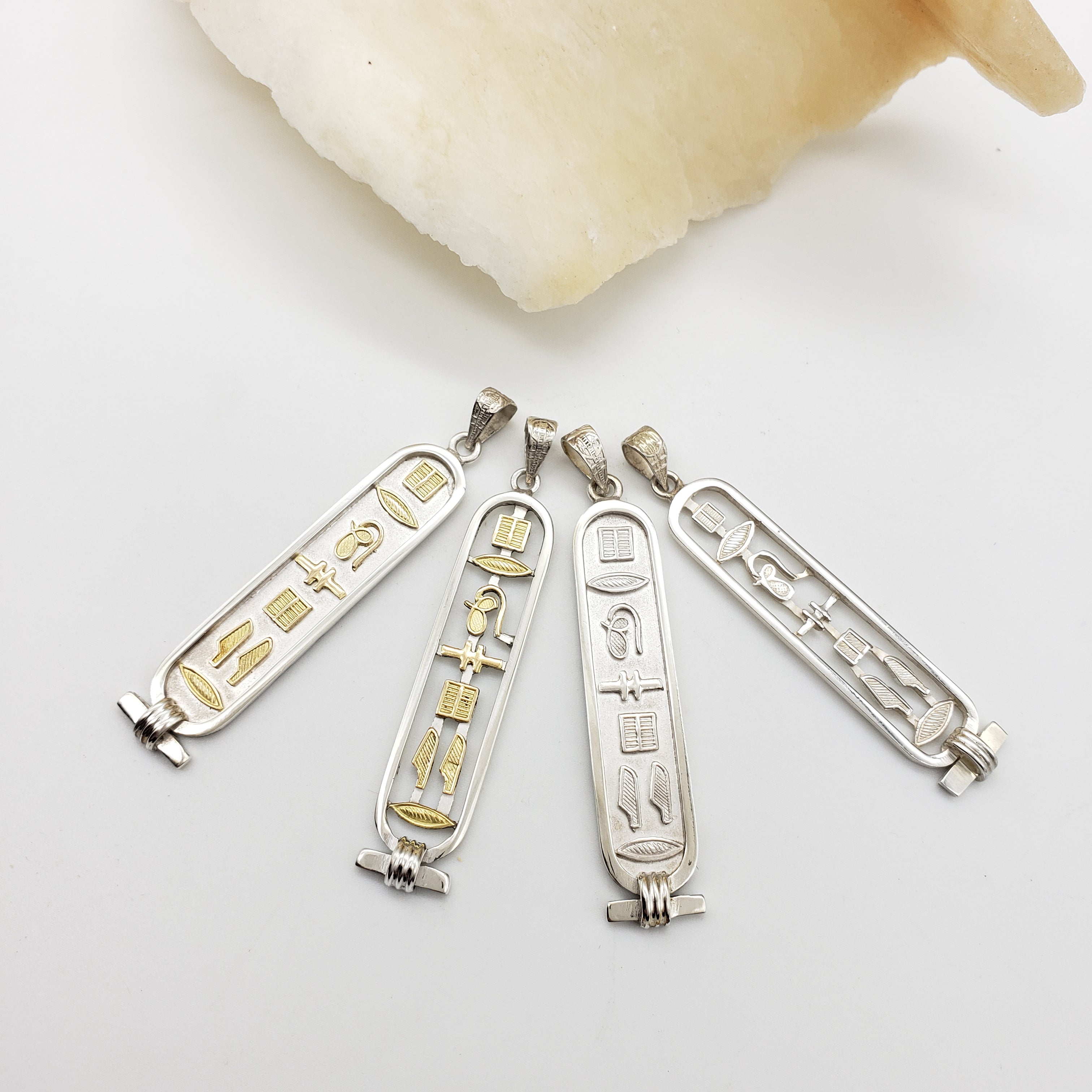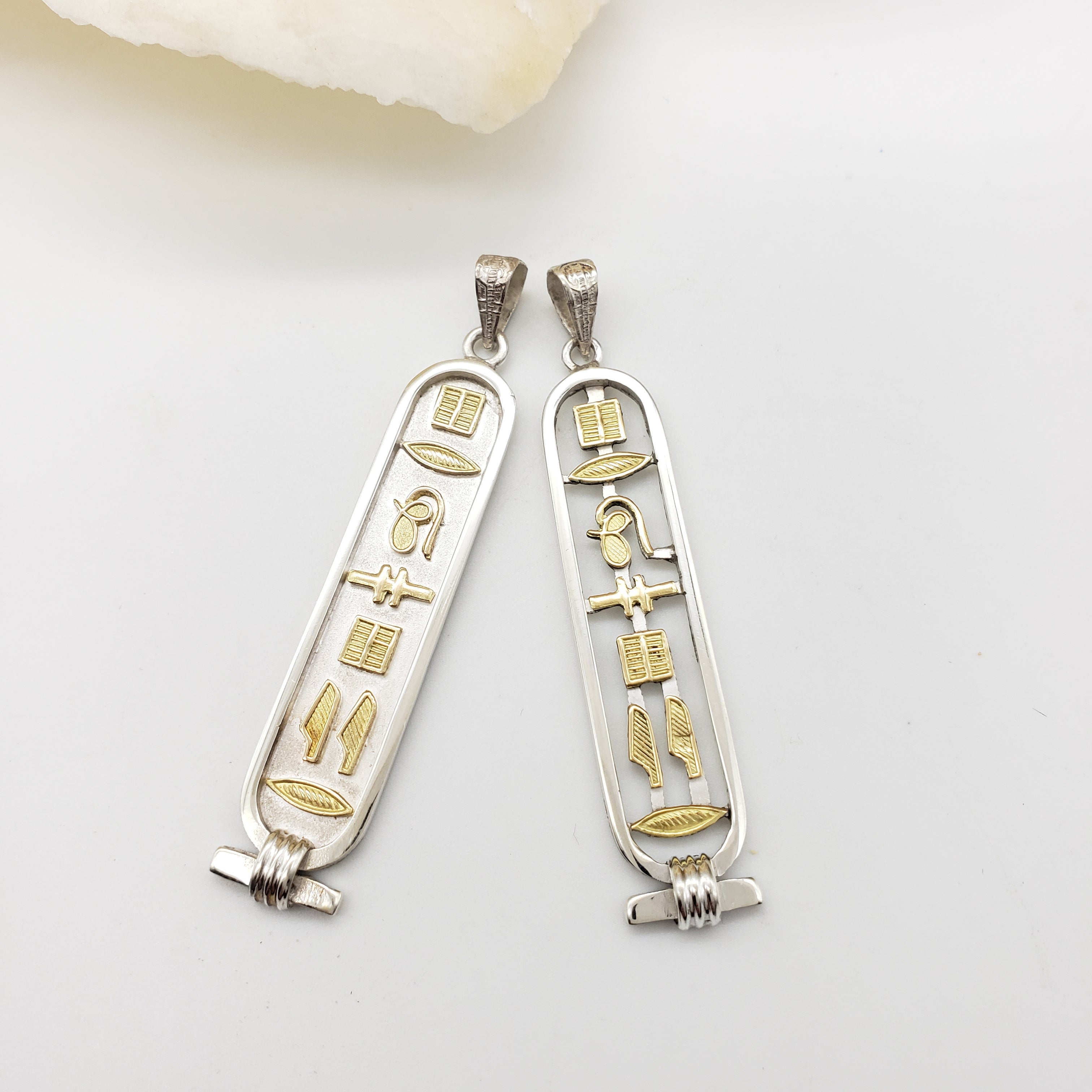 Choose from two styles, open or solid, in Sterling Silver or Sterling Silver with18k Gold symbols. Each cartouche is stamped (often times in two places) with the Egyptian government's hallmark certifying the metal content.