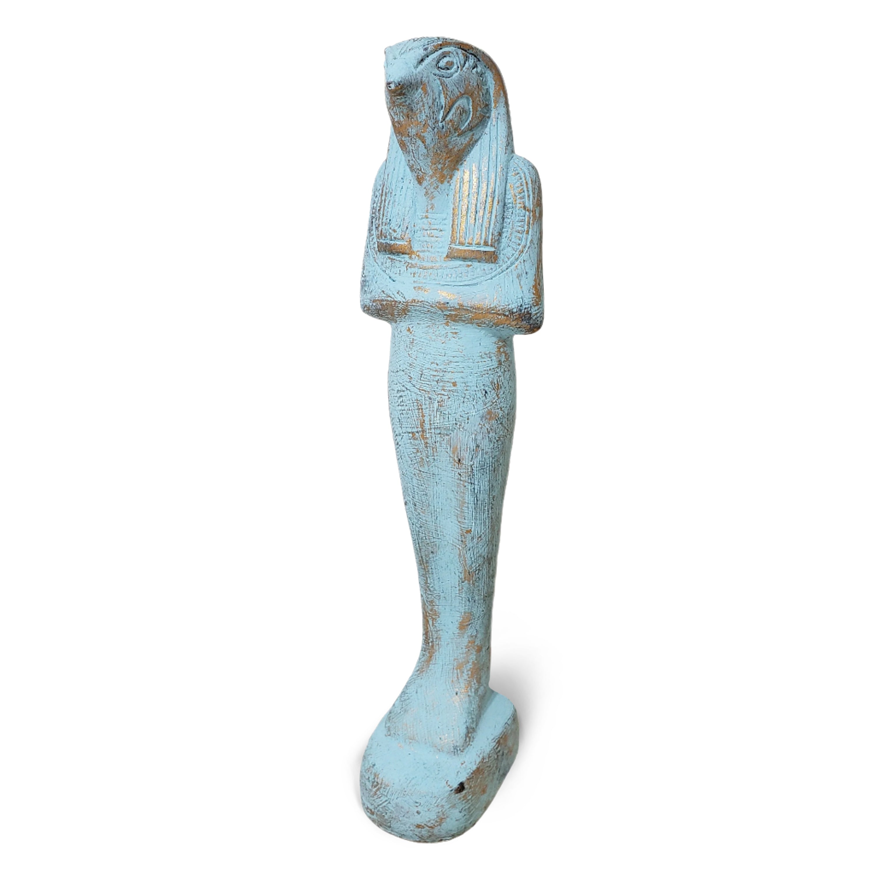 This Egyptian God Ra statue was meticulously crafted with amazing details. Ra the sun-God whom over time was transformed into several manifestations, morphing into Amun-Ra, Montu-Ra, and eventually Horus. Ra's cult was at the ancient site of Iunu, present day Heliopolis, a suburb of Cairo. This statue was handmade from polymer with a patina finish. There are some black marks on the statue-please see photos Made in Egypt! This statue will ship in a box with hieroglyphic designs.