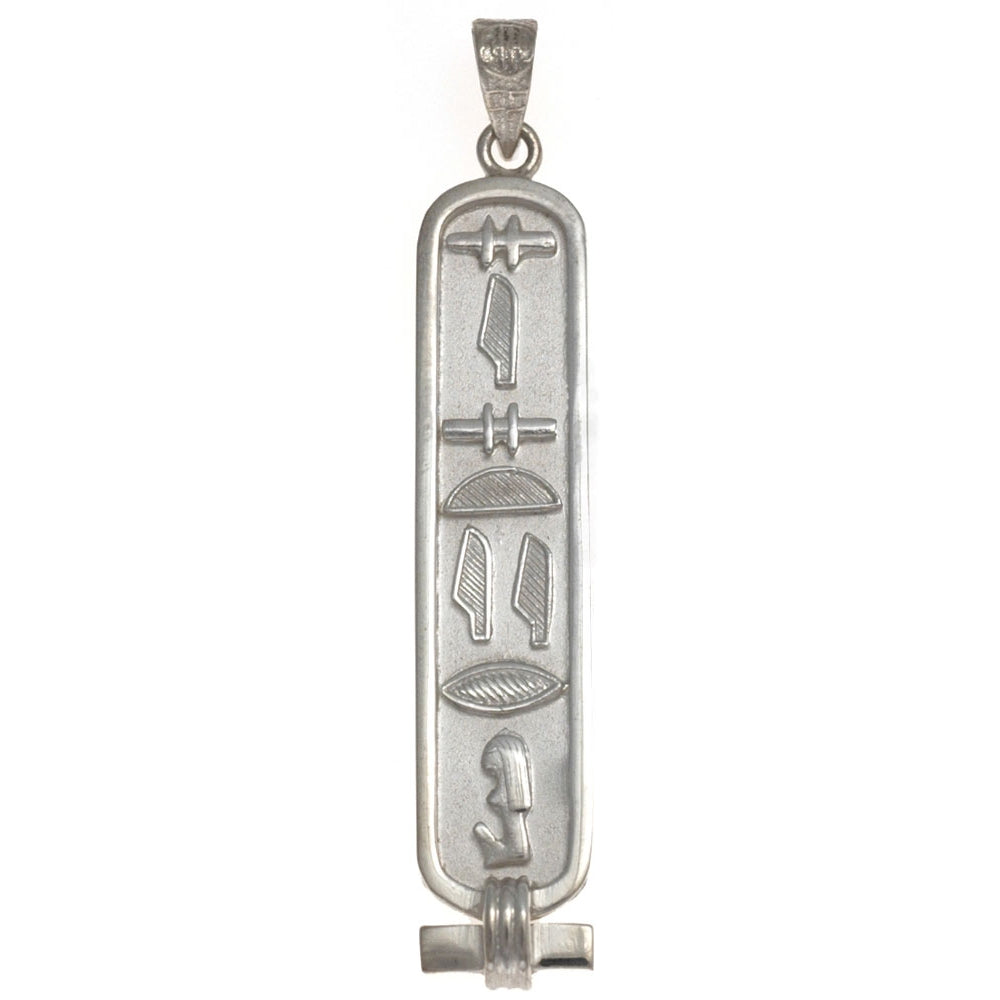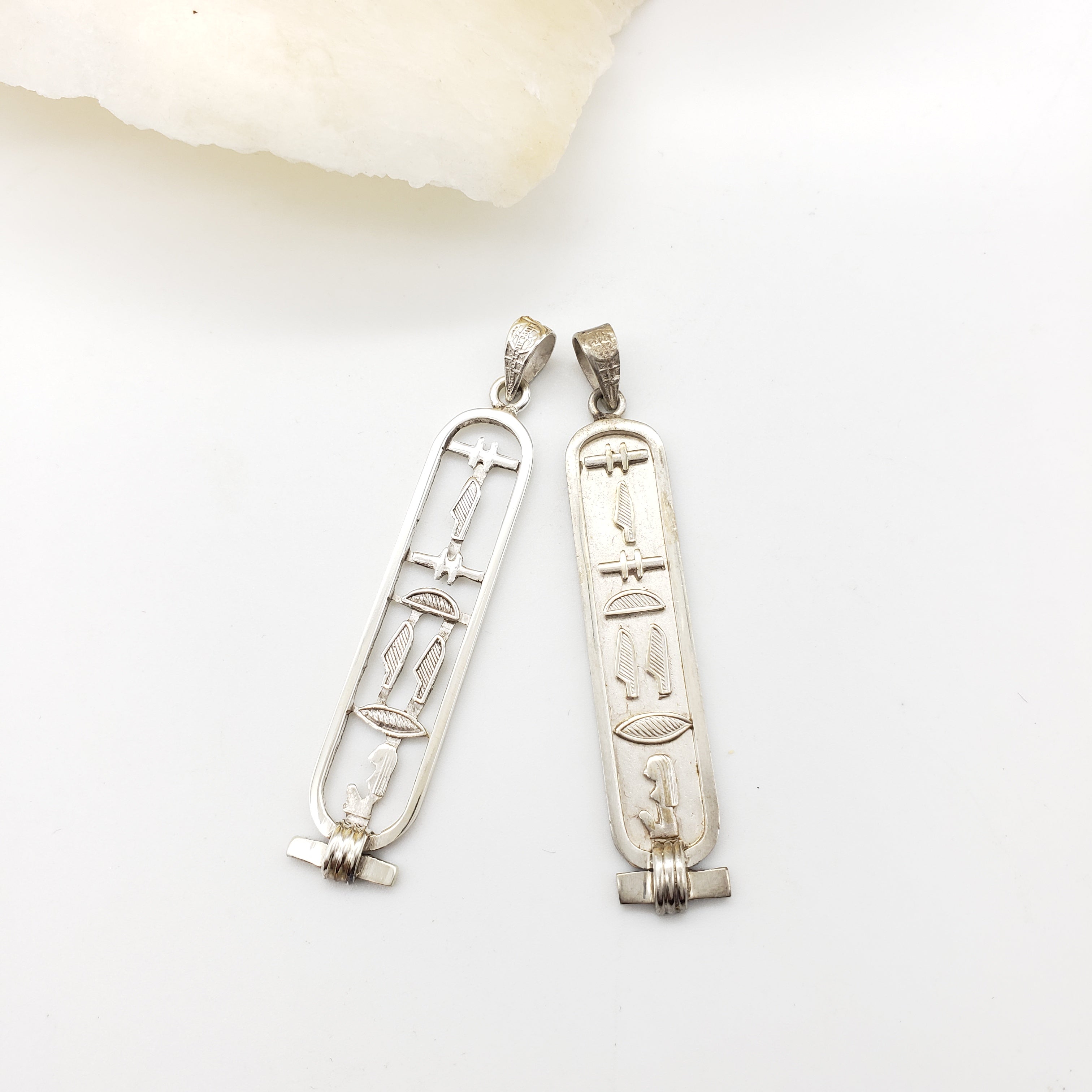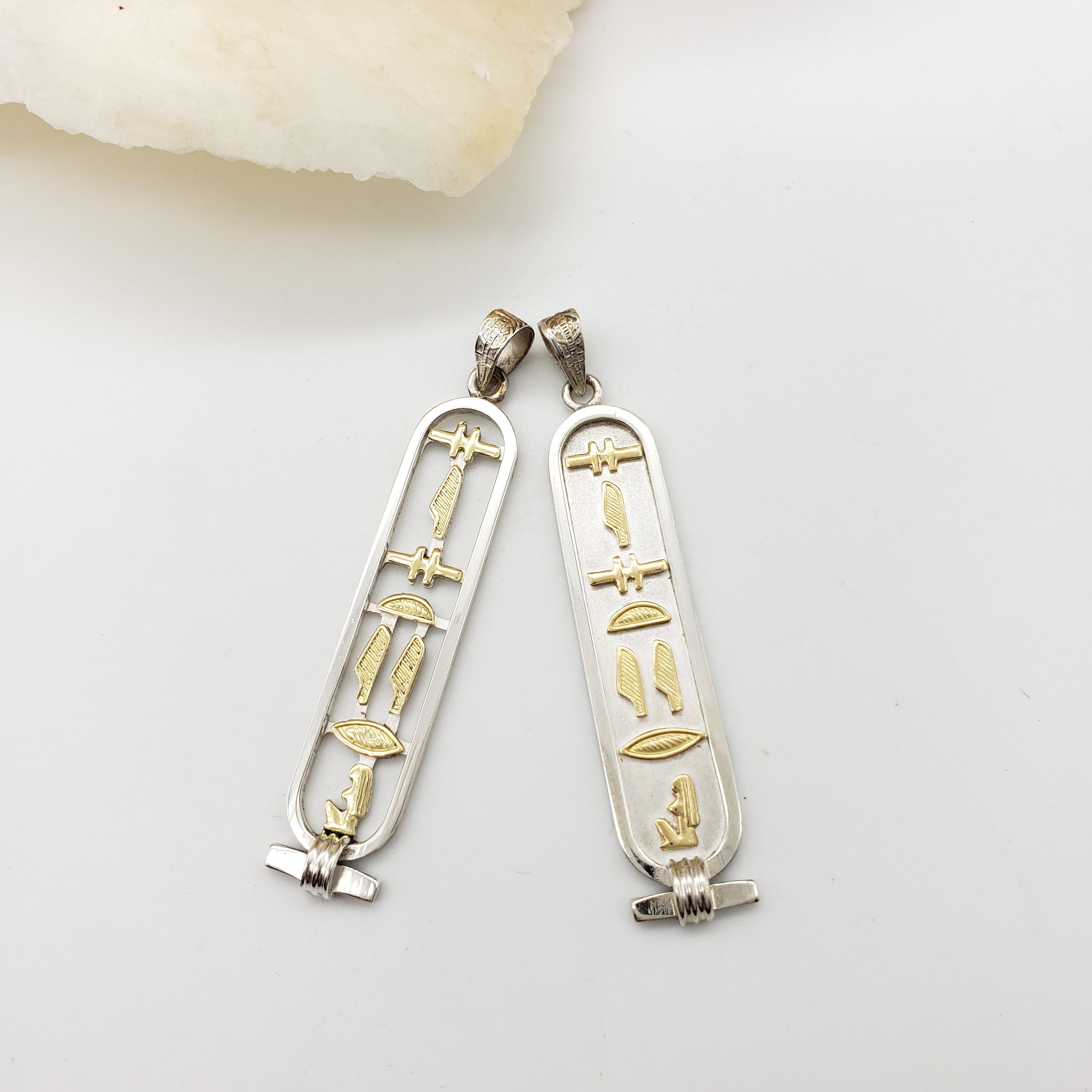 Choose from two styles, open or solid, in Sterling Silver or 18k Gold. You may also order Sterling Silver with 18k Gold hieroglyphs in either the solid or open style pendant. Each cartouche is stamped (often times in two places) with the Egyptian government's hallmark certifying the metal content.