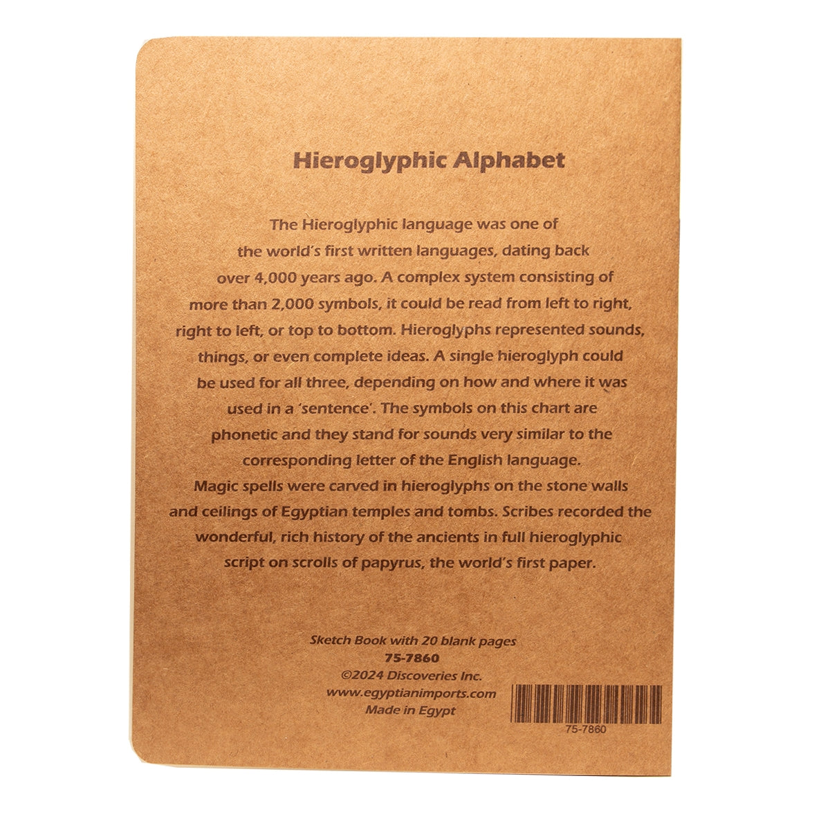 This softcover sketchbook features a representation of the Hieroglyphic Alphabet. There are 20 blank pages inside with a printed design on the front and informational section on the back. The sketchbook is unlined and staple bound. Printed by our artisans in Cairo, Egypt and designed specifically for our store! It is 5.5 inches wide by 8.25 inches tall. This listing is for one sketchbook per order.