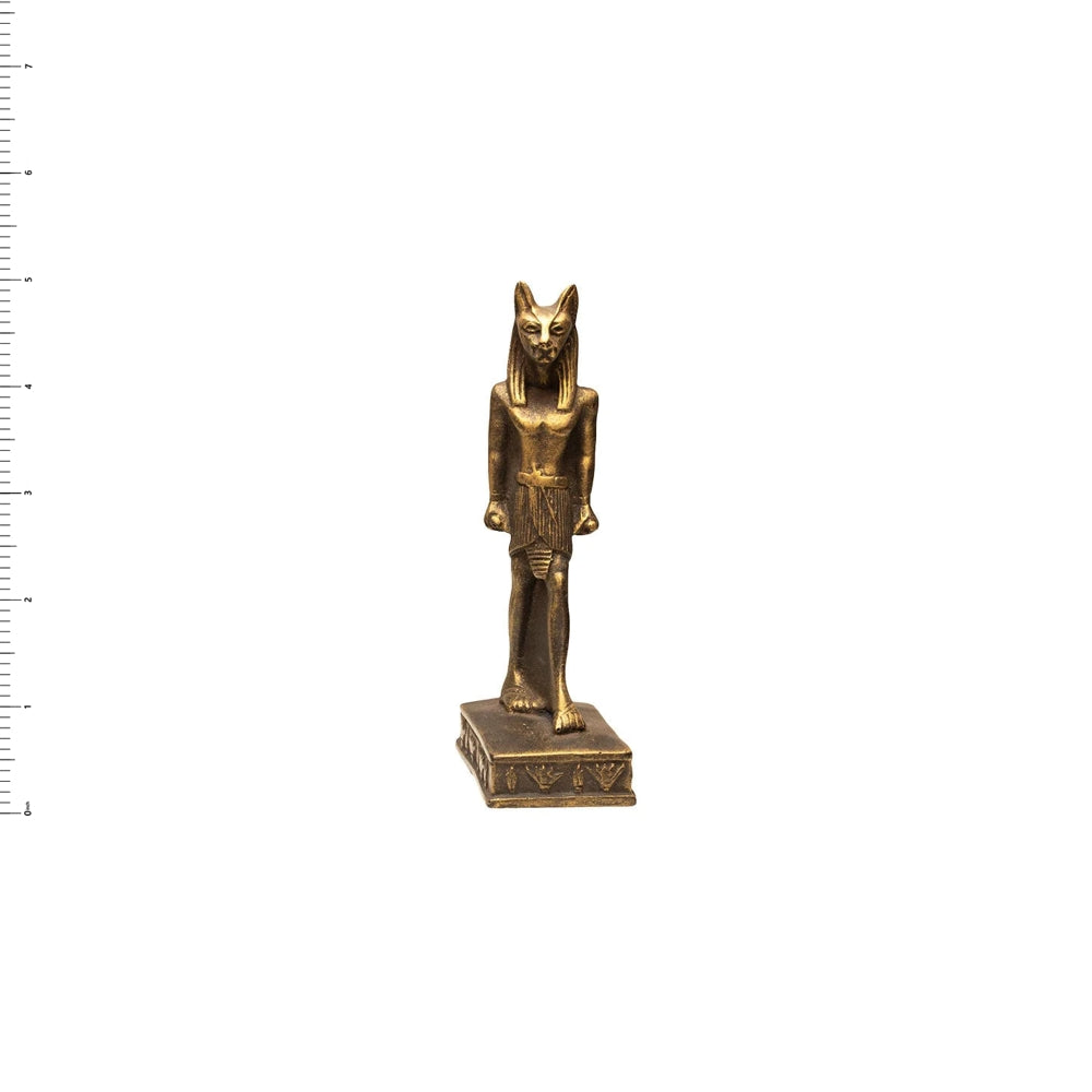 This statue is 5 inches tall and is in the likeness of the Egyptian goddess Bastet. Made in Egypt! This statue is made of durable polymer resin. This statue will ship in a box with hieroglyphic designs--perfect for gifting! We will also include an information card about the goddess Bastet.