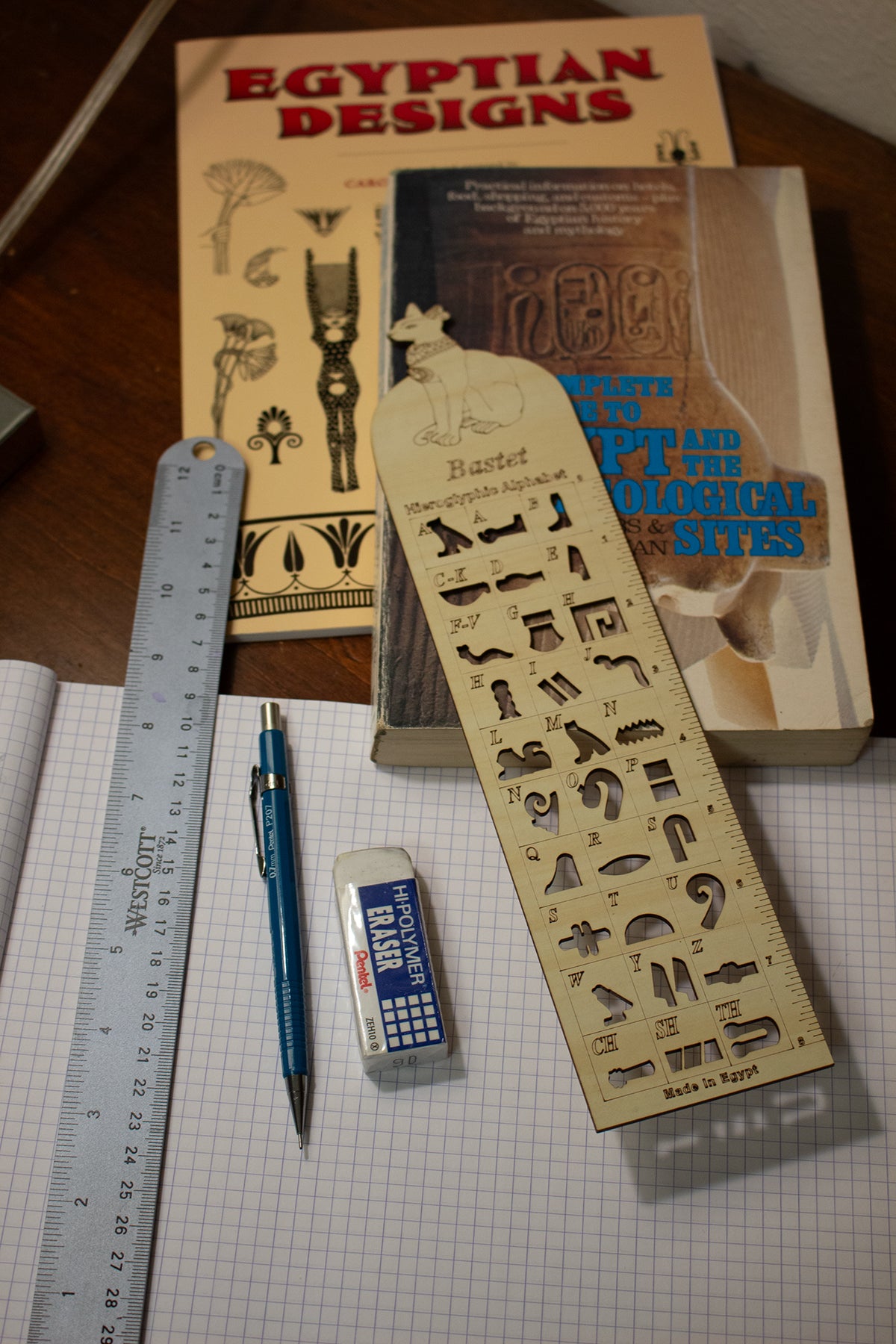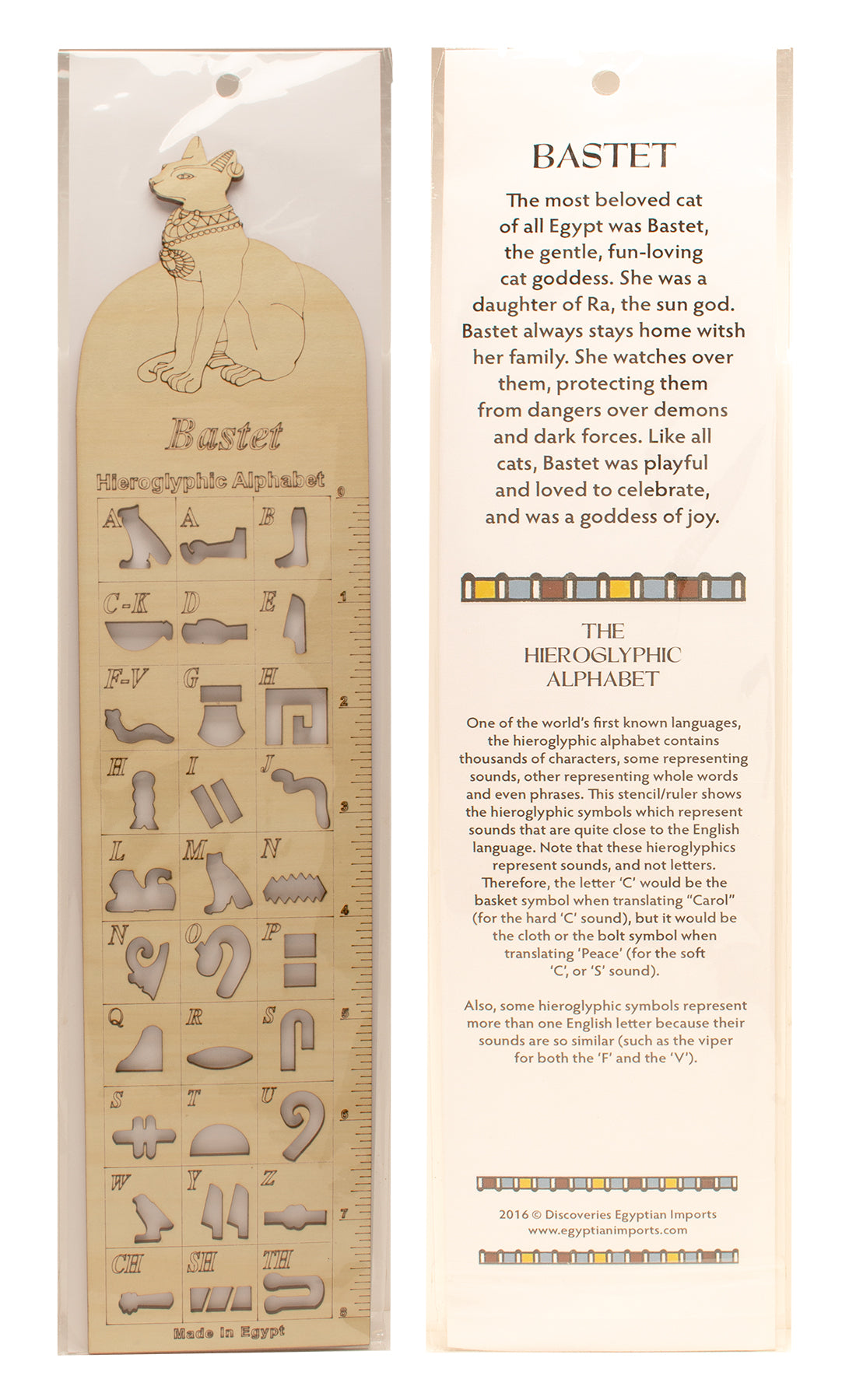 This wooden hieroglyphic stencil ruler has a Bastet cat symbol at the top. These rulers are sold individually.
