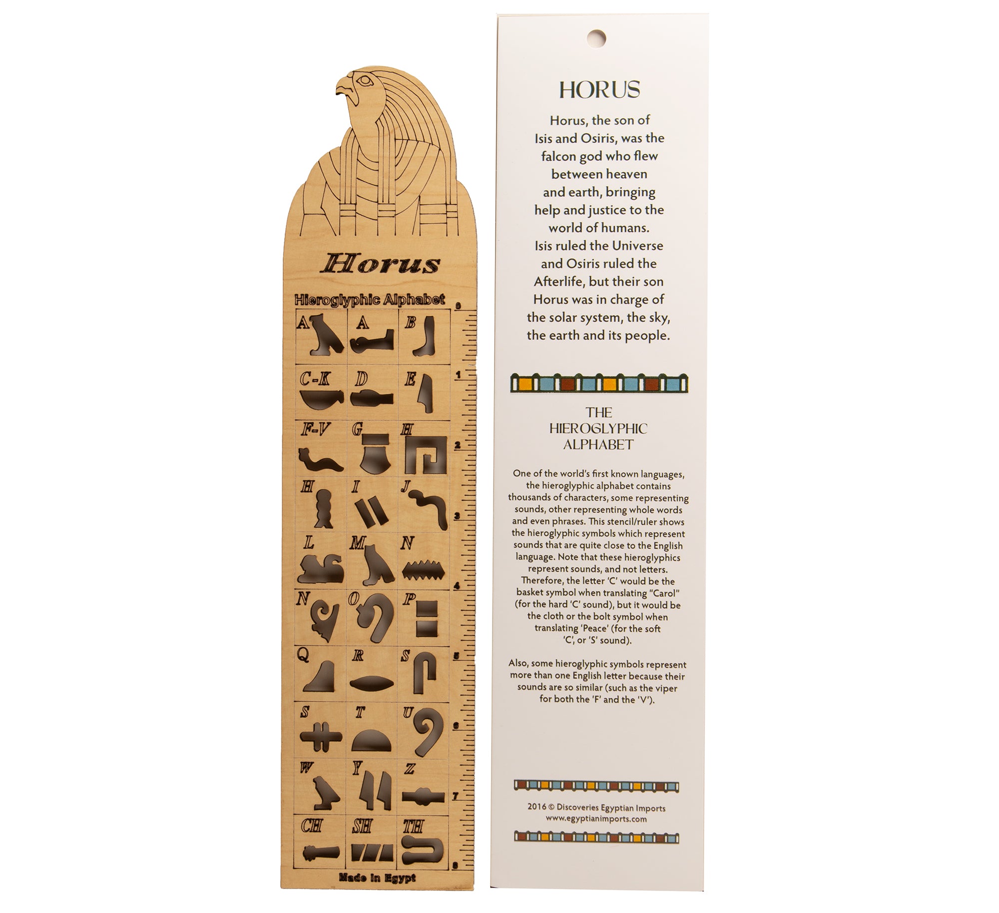 This wooden hieroglyphic stencil ruler has a profile of the Egyptian God Horus at the top. These rulers are sold individually.